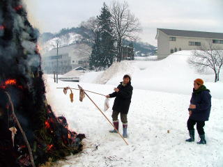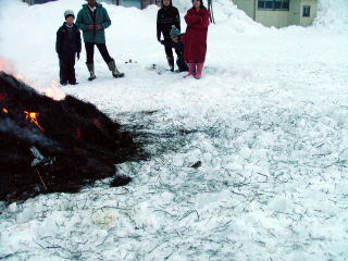 向こうに 南町のどんど焼きの煙がみえる