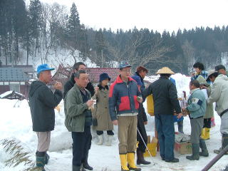 雪山を崩して、平らに会場作りを