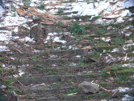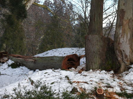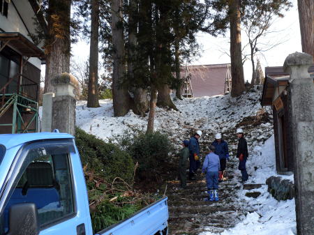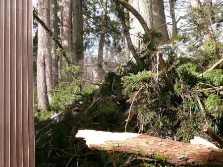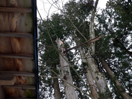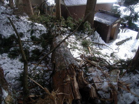 折れた木はお寺の石段を横切り、弘法さん・寺の車庫の