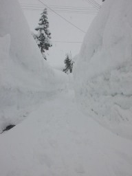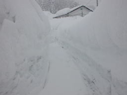 | 車道にでるまでの道です。雪の壁が3メートル以上あります。 雪屁ができた。雪屁落しをしなければ通行も危険になってきた。 |
