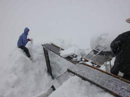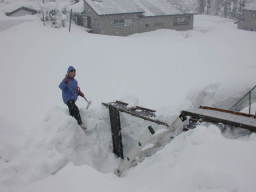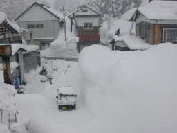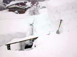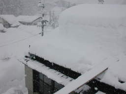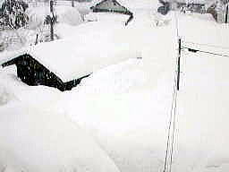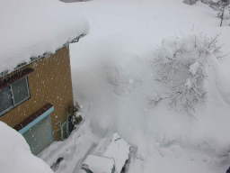 | 屋根の上で撮りました。屋根の上からすべり板で 雪の塊を滑らせて下に落としますが、廻りの雪がいっぱいで すべり板の先端が直ぐにつかえてしまいます。 |