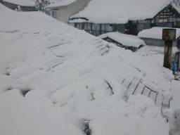 | 屋根にはまだ半分の雪が残っているのだが・・・・・ | |