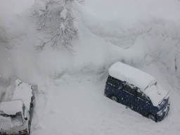 | 下に小さく見える軽トラックの右側の雪の壁を見てください | |