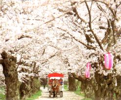川面いっぱいに鯉のぼりが泳ぎ、満開の桜並木を観光馬車が走ります。
